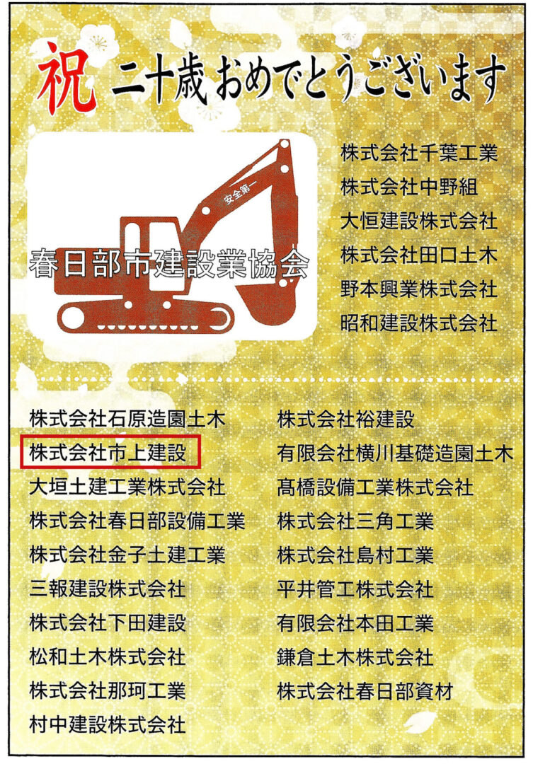 当グループ会社の(株)市上建設は、春日部市建設業協会の一員として、春日部市二十歳を祝う会記念誌に今年も協賛いたしました。