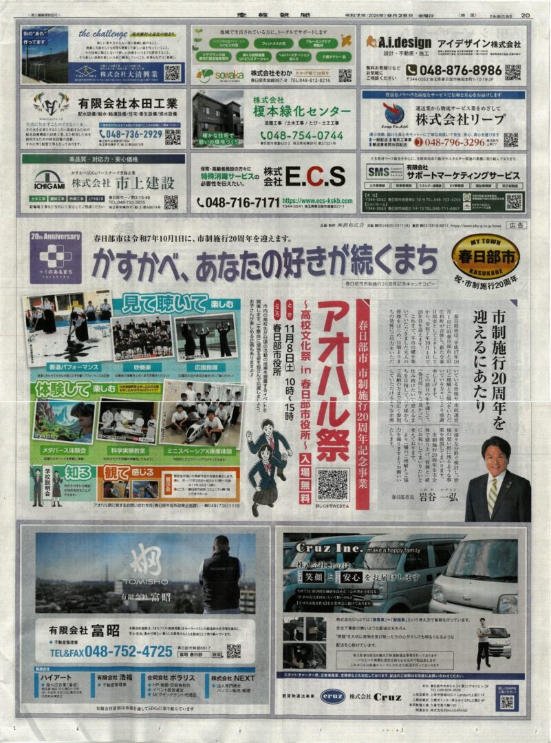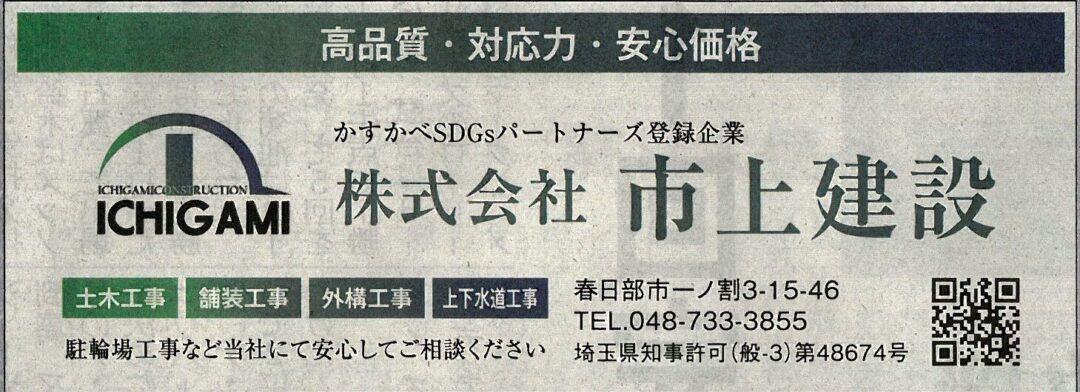 📰市上建設が産経新聞『春日部市制20周年記念特集』にお祝いの広告を掲載しました2025.10.039月26日付の産経新聞「春日部市制20周年記念特集」に、グループ会社の市上建設が春日部市制20周年を祝して広告を掲載いたしました。今後も地域に根ざした企業グループとして、皆さまの暮らしとまちづくりに貢献してまいります。