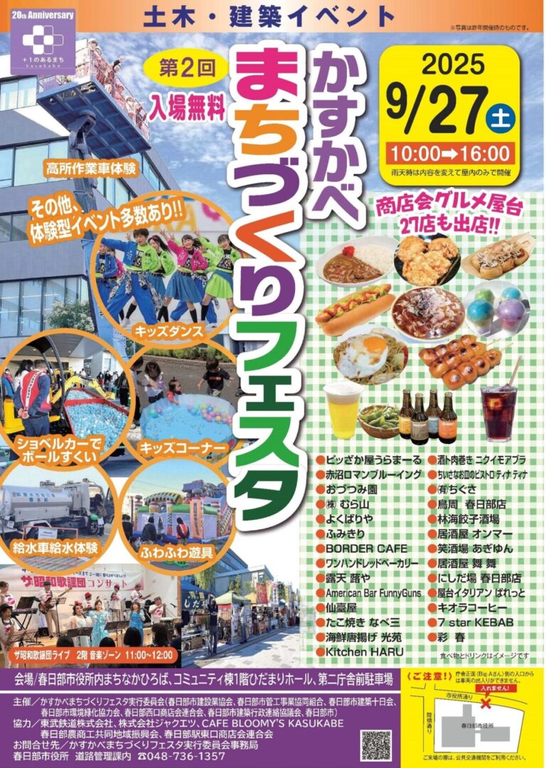 9月27日(土)に開催された「かすかべまちづくりフェスタ」に、沖田土木グループの社員がスタッフとして参加し、運営のお手伝いをさせていただきました。